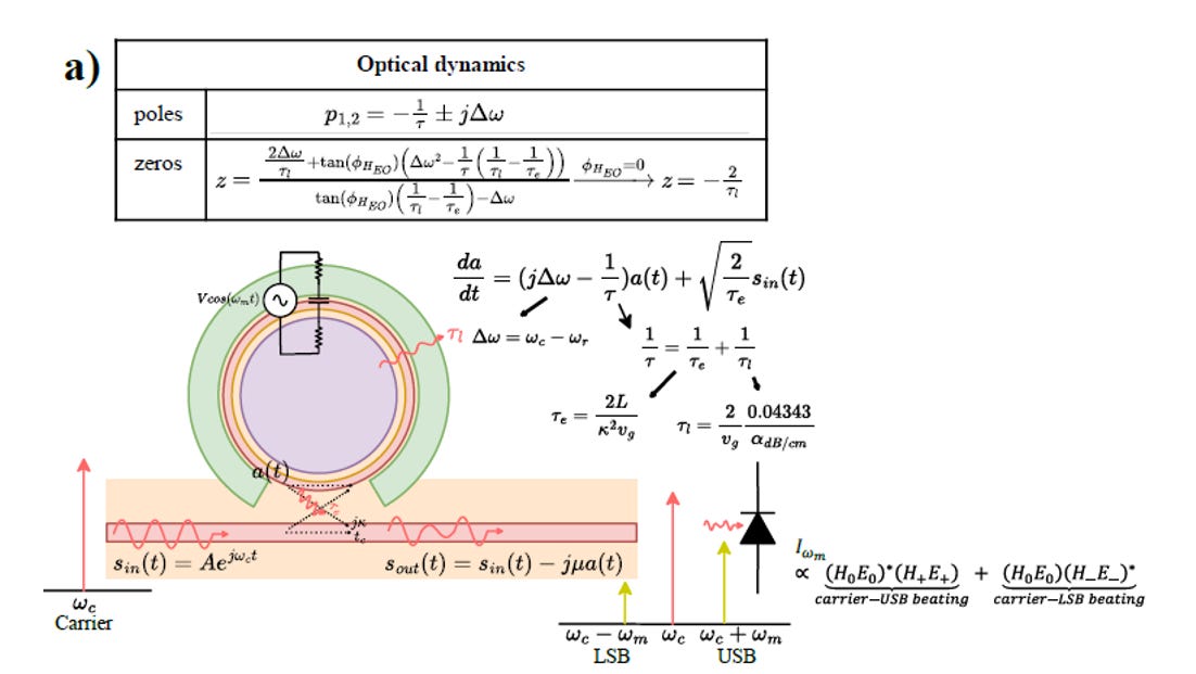 非線性失真: 最終光偵測器接收到的電流 (Iωm) 是載波與邊帶的拍頻 (Beating) 結果。由於 Lorentzian 頻譜的斜率是不對稱且非線性的,當高速訊號的邊帶超出微環的光學線性區時,訊號會遭遇嚴重的振幅衰減與群延遲 (Group Delay) 變異。