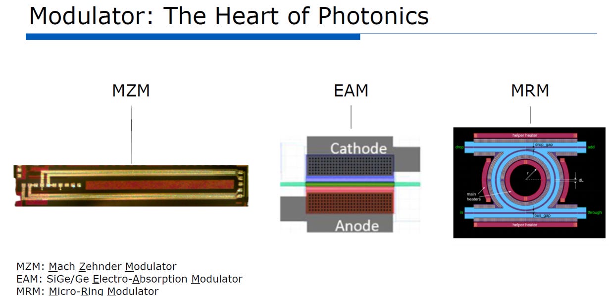 在共同封裝光學 (CPO)架構中的矽光子 (Silicon Photonics, SiPh) ,光調變器 (Modulator) 扮演「電光轉換(EO)」的核心角色。它負責將晶片運算出的高速電子訊號,轉換為光纖中傳輸的光訊號。由於資料中心與 AI 運算對頻寬密度、功耗與散熱的要求日益嚴苛,產業界在調變器的選擇上出現了不同的技術路線。各家大廠依據其系統架構的需求與權衡 (Trade-off),分別有 MZM、EAM 與 MRM 三種主要技術(請參考EP14. SiPH MRM介紹; EP27. Marvell + Celestial AI = ?)。