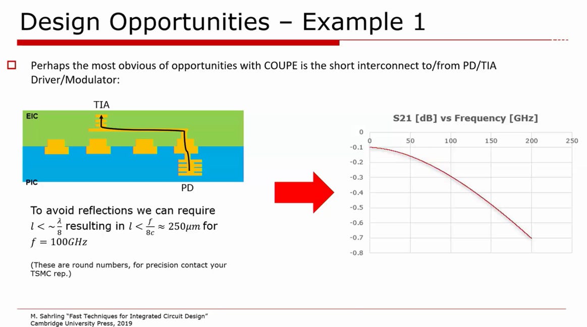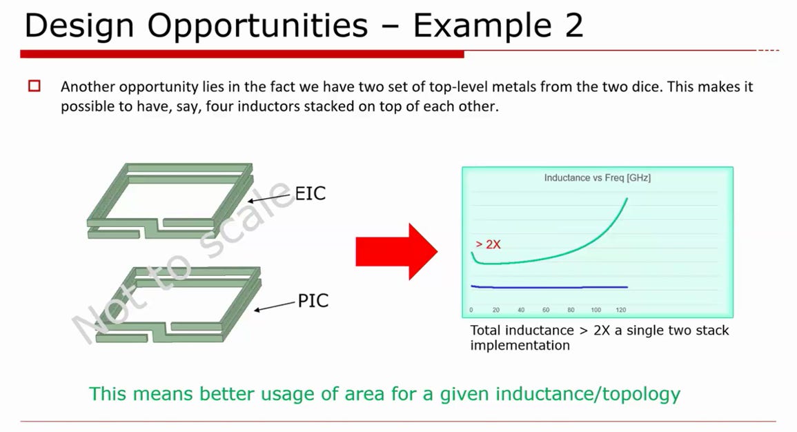 SoIC-X 優勢: 系統現在同時擁有了 EIC 與 PIC 兩顆晶片的頂層金屬線 (Top-level metals)。設計者可以將 EIC 的電感與 PIC 的電感在垂直方向上對齊堆疊