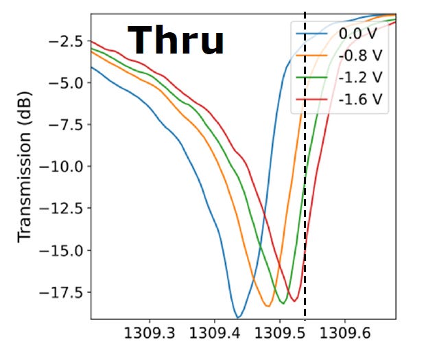 根據矽的光學色散物理,載子濃度下降會導致矽的折射率上升。折射率上升同樣會使共振頻譜向右側 (紅移) 偏移。