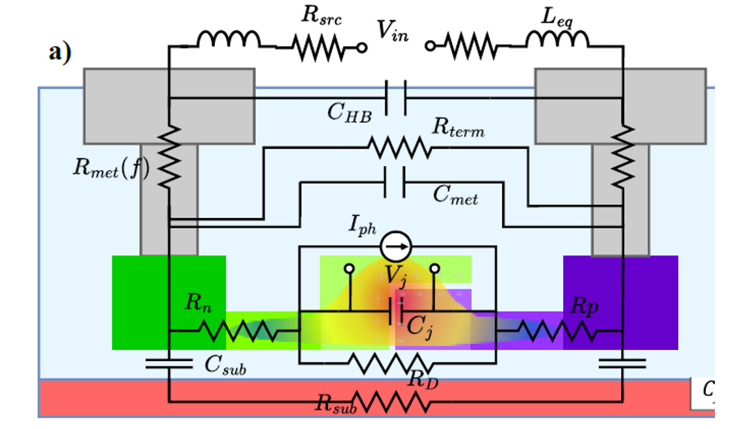 將 MRM 的實體結構(包含金屬層、PN 接面、基板)對應到等效電路圖上。模型可以分為三個主要區塊: