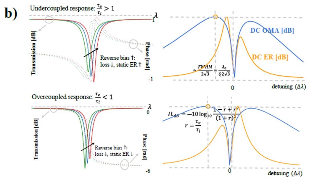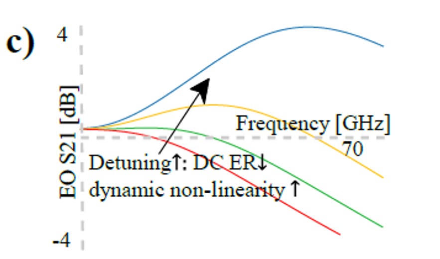 系統會將工作點設定在共振頻譜的「斜坡」上,而非谷底,以此在調變幅度 (OMA) 與消光(ER)比之間取得最佳平衡,並依賴後端的 DSP 進行非線性預先補償