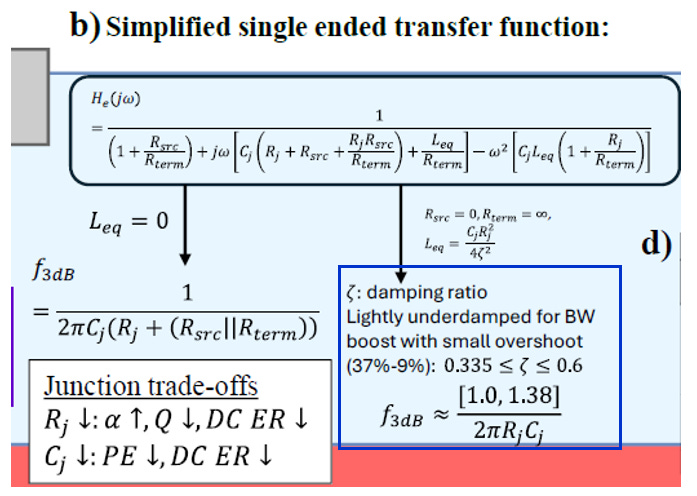 上方圖 的公式He(jω)定義了從輸入電壓到接面電壓的單端傳遞函數。因為模型中同時包含了電容(Cj 等)與電感(Leq),這是一個標準的二階(Second-order)低通濾波器響應系統。