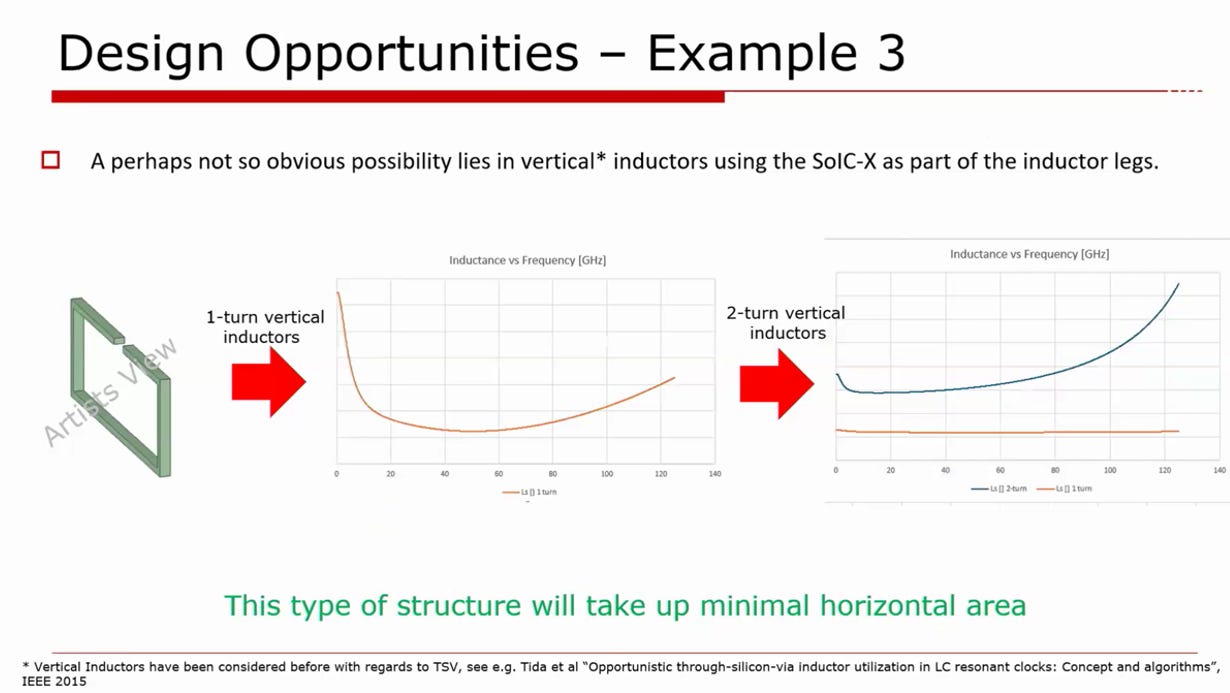 SoIC-X 優勢: 這是一個非常創新的設計概念。工程師直接利用 SoIC-X 介面的銅對銅鍵合柱 (Bonding pads/vias) 作為電感的垂直導電腳 (Inductor legs),結合 EIC 與 PIC 的金屬走線,形成一個跨越兩顆晶片的「垂直線圈」