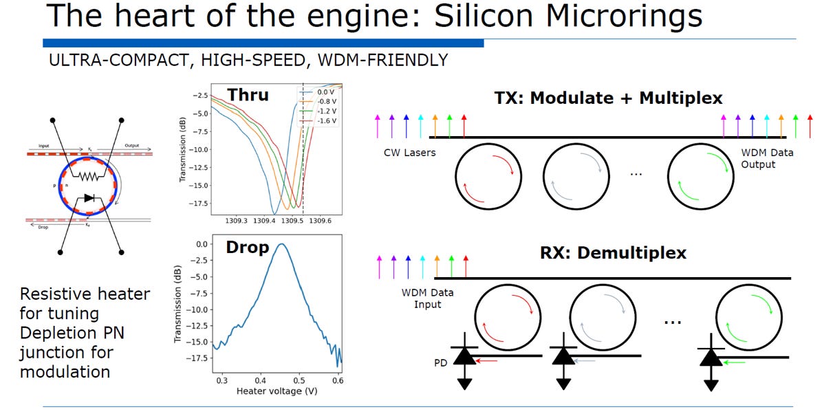 傳統矽光子多採用體積較大(毫米等級)的馬赫-曾德爾調變器 (MZM),難以滿足 CPO 的高密度需求。MRM 的尺寸僅微米等級,大幅縮小物理尺寸,允許在單一光子積體電路 (PIC) 上高密度佈建光學通道,從而實現數十 Tbps 的總頻寬。