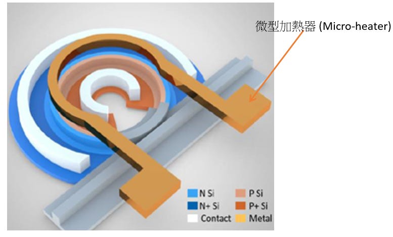 位於波導上方的金屬環形結構 (箭頭所指處)。矽的折射率具有顯著的熱光效應 (Thermo-optic effect),微環的共振波長會隨環境溫度漂移。加熱器透過輸入低頻直流電流產生焦耳熱,提供局部的溫度控制,將微環的共振波長精確「鎖定」在雷射的工作波長上。